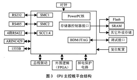MPC860 PowerQLJlCC微处理器是一个多用途的通用芯片,内部集成了微处理器和常用外围组件,可用于各种控制领域,特别适用于通信产品。MPC860集成了嵌入式PowerPC核和一个为通信使用的专门的RISC的通信处理器模块(CPM)。MPC860的CPM支持6个串行通道(4个串行通信控制器SCC、2个串行管理控制器SMC、1个I2C(Inter-Integrated Circuit)接口和1个串行外围接口电路(SPI)。MPC860还提供1个快速以太网控制器,可以支持10Mbps到100Mbps的以太网。由于CPM分担了嵌入式PowerPC核的外围工作任务,这种双处理器体系结构比传统体系结构的处理器具有更高的效率和更高的可靠性。图3为主控系统结构。
