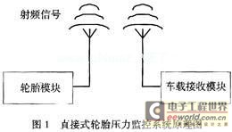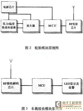 该系统的基本工作原理如下,把轮胎模块装置在轮胎内,压力和温度传感器检测轮胎内部当前的应力和温度信息,获得的模拟信号经过A/D变换器转换成数字信号,然后通过射频发射器发送出去。车载接收模块装置在驾驶室内,射频接收器接收来自轮胎模块的应力和温度信息,当轮胎压力过高或者过低时,通过显示和报警装置发出报警信息。
