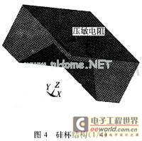 其中,压阻式压力传感器主要是利用半导体的压阻效应,把一个惠斯通电桥做在一个硅杯上,如图4所示。当硅杯受到压力后发生形变,惠斯通电桥的四个桥臂电阻就会发生变化,打破了电桥的电平衡,从而会有一个电信号的输出。