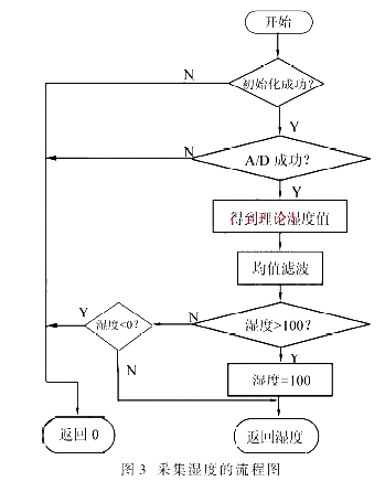 前面已经介绍过,数据采集包括温度和湿度的采集,选用的温湿度传感器是CHTM-02A,该器件的转换速度快,线性度非常理想。图3为采集湿度的流程图。