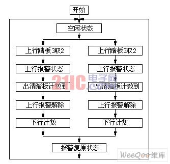 程序流程采用导向安全机制,将道口从空闲到列车通过到出清分成几个状态,在相应的运行策略实现道口自动报警的功能。步骤如下:(1)组织MCGS的用户窗口实现简单清晰的可视化界面。(2)利用强大的报表功能记录道口的报警情况并保存在系统中。(3)使用MCGS的运行策略能方便的控制流程并进行故障诊断。(4)使用MCGS的实时数据库保证道口报警控制系统的可靠性和稳定性。(程序流程见图2)