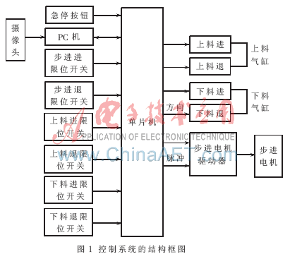 本文所设计的VCM磁钢快速检测控制系统主要是与快速智能检测系统中的机械、气动及检测部分相结合,利用单片机控制技术实现VCM磁钢快速智能检测系统的上料、分拣与下料等动作。控制系统的结构框图如图1所示,在检测设备控制系统中,主要输入部分有急停按钮开关、PC机通信、步进电机的限位开关、上料下料的限位开关等,主要输出部分有上料下料气缸和步进电机等装置。控制原理是单片机通过采集输入量的信号,对上料下料气缸和步进电机等输出元件进行相应的控制,实现VCM磁钢上料、检测、下料的快速智能检测过程。