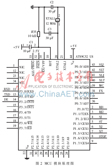 MCU模块主要由AT89C52单片机和晶振电路组成,是整个控制系统的“大脑”,根据各个输入电路模块的输入信号,按功能进行相关的逻辑控制,并输出相应的控制信号,驱动气动部分和步进电机,实现VCM磁钢快速智能检测系统的上料、分拣、下料的动作。模块原理图如图2所示。
