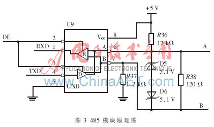 485模块主要是实现控制系统与PC机中的上位机软件进行通信,接收上位机发送过来的动作按钮及检测结果,反馈给MCU模块,由单片机对气动部分和步进电机进行控制,实现上位机响应的动作指令。其原理图如图3所示。
