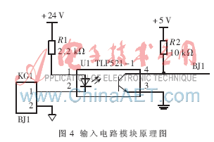 输入电路模块主要由7路相同的光耦隔离电路组成,分别用来采集急停按钮、上料进限位和上料退限位开关、下料进限位和下料退限位开关、步进进限位开关和步进退限位开关等的状态信号,传递给单片机,由单片机实现相应的动作控制。其原理图如图4所示。