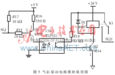输出电路模块主要由4路气缸驱动模块和2路步进电机的驱动模块组成,其原理图分别如图5、图6所示。4路气缸驱动模块分别用来驱动上料气缸的上料进和上料退、下料气缸的下料进和下料退。2路步进电机驱动模块用来控制步进电机的脉冲和方向。通过单片机对这些输出模块的控制,从而实现VCM磁钢快速智能检测系统的上料、分拣和下料动作。