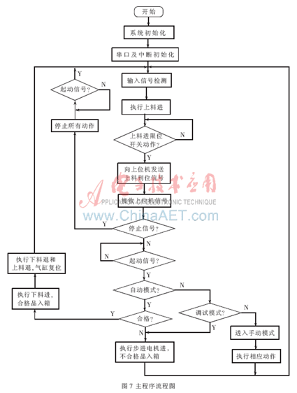单片机控制系统的软件主程序流程如图7所示。首先要进行系统的初始化,主要完成对单片机端口的初始状态和一些变量的初始值的设定,同时也要对串口及中断进行初始化,完成串口通信速率及中断使能等初始设置。系统先对输入的开关量进行扫描,然后执行上料进,将磁钢推至相机下方,并向上位机发送上料到位信号。如果上位机接收到上料到位信号,就会回复确认信号,如果此时上位机已经执行了相应的操作,随后上位机就会将这些操作命令以字符串形式发送给下位机。如果下位机接收到的是上位机的停止信号,则马上停止当前的动作,等待下一个命令的动作。而且由于控制系统执行了停止操作,所以系统要先执行一次起动操作,才能使系统复位,重新接收并执行新的动作命令。如果前面接收到的不是停止命令,而是起动命令,首先要判断运行模式。如果是自动模式,则要判断磁钢是否合格,如果合格,则执行下料进动作,将合格品推至合格料箱里。如果是不合格品,则先要执行步进电机的进动作,然后执行下料进动作,将不合格品推至不合格料箱里。如果在自动模式中选择的是单次动作,那么,至此就分别完成一个合格品和不合格品的上料、分检、下料动作。如果选择的是连续动作,则系统接下来将会循环地执行上面的动作,直到接收到上位机的停止命令或控制板上的急停操作为止。如果是处于调试模式,则相当于执行一次不合格品的操作过程,即先要执行步进电机的进动作,然后执行下料进动作,将不合格品推至不合格料箱里。如果系统是处于手动模式,则系统执行上位机发送过来的相应的上料进、上料退、下料进、下料退、步进、步退中的一种动作,然后再进行下一轮新的动作过程。其中,步进电机的速度是根据上位机发送过来的步进电机的脉冲频率来确定的。另外,单片机系统和上位机之间的数据交换都是通过串口实现的。由于采用的是RS485通信,所以单片机系统和上位机之间只能进行半双工通信,所以,双方之间的收和发的协调很重要,否则会引起通信中断,导致系统死机。为保证系统的可靠性,除了在硬件设计上加强隔离、屏蔽、滤波、抑制等措施外,还在软件设计上通过在程序中适当的位置设置软件看门狗来增强软件的抗干扰,当程序受到干扰跑飞或进入死循环时,能将程序强制复位。