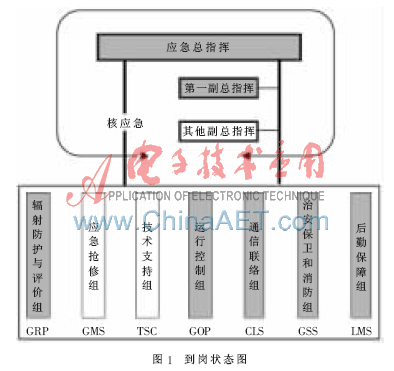 应急相关人员就位后通过应急决策系统报告到岗就位,系统根据反馈情况自动填充应急组织状态图。未到岗人员或组织白色显示,全部就位的个人或组织灰色显示,如图1所示。