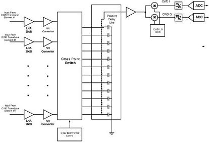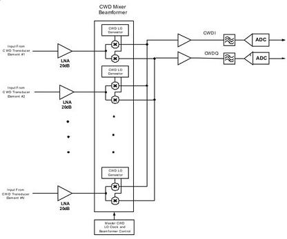 典型的相控阵CWD(连续波多普勒)架构中,超声传感器的聚焦孔径分成两部分,一半的(64至128个)传感器单元用于发送器,另一半用于接收器。作用在发射单元的信号是方波信号,典型频率为2.0 MHz至7.5 MHz多普勒频率。发射单元通过发送适当相位的信号聚焦发射波束。同样,CWD接收信号通过对每个接收单元的信号进行相位调整、求和进行聚焦。