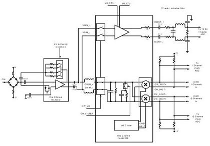 过去,由于缺乏适当的集成工艺,很难实现高性能的波束成型架构。但目前这一问题已经得到解决,完全集成的8通道VGA和8通道CWD I/Q混频器以及配套的可编程LO驱动器已经开始供货,图3所示给出了这类器件MAX2038接收链路的示图。采用这种架构可以使超声系统达到优异的CWD性能,不存在上述延时线CWD架构的局限性。