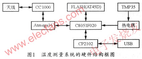 另外,采用Atmegal6相配合的目的是为了提高系统的采集速度,进而提高温度测量的灵敏度。通过CCl000完成短距离无线通信。FLASH芯片可对温度数据进行存储,以在无线通信故障时读取。C8051F020通过CP2102的转换后,可用USB端口与上位机通信。本系统的硬件结构框图如图1所示。