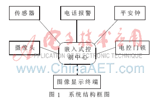 系统囊括了无线可视门铃、电话报警终端、平安钟、电控门锁和烟雾、温度等传感器,通过2.4 GHz无线传输模块和有线电话网络实现通信及报警功能。系统以ARM9嵌入式为核心,分为四大部分:安全检测部分(包括平安钟、烟雾温度传感器以及撬门动作检测)、图像采集与处理部分、无线传输部分及电话报警部分,其系统框图如图1所示。