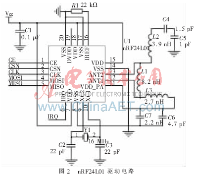 图像无线传输电路采用基于无线收发芯片nRF24L01的模块。nRF24L01是一款工作在2.4 GHz ISM频段的单片无线收发芯片,芯片高度集成化,仅需少量阻容元器件即可实现无线收发功能,具有极低的电流消耗,硬件电路如图2所示。
