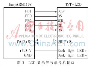 图像接收与显示终端作为无线可视门铃的一部分,主要实现对主控中心传来的图像数据的接收和显示,并控制电控门锁的开关。模块采用LM3S1138控制,由nRF24L01接收,并通过2.4寸彩色TFT液晶屏LTM024D130显示。LTM024D130支持16位真彩色显示,其位数R:G:B为5:6:5。液晶屏采用8位并行总线驱动,与MCU的接口电路如图3所示。