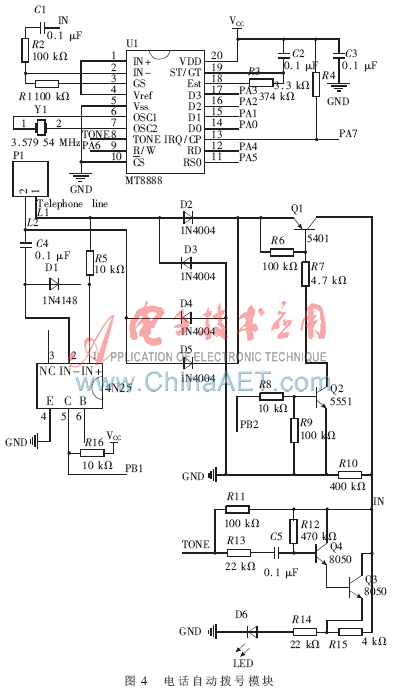 电话报警电路采用双音多频(DTMF)信号编解码芯片MT8888。该芯片功能强,具有Intel微处理器标准接口,功耗低(仅57.8 mW),工作稳定可靠,可用于电话自动拨号报警。