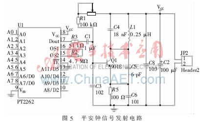 平安钟做成无线编码发射机,采用TP2262进行编码,然后利用315 MHz频段的无线电进行发送,老人只要在紧急情况下按住按键,即可不断地发射一定规律的编码,主控部分接收解调后进行软件解码,识别出相应键值,拨号告知主人并报警。