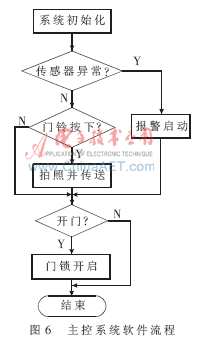 系统包含三个用于控制的MCU,其中S3C2440为主控中心,实现图像采集、编码、发送功能,系统异常检测以及报警功能调度,嵌入Linux 2.4内核,软件流程图如图6所示。