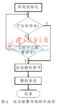 Atmega16为电话报警终端控制器,实现功能为报警信号的接收和自动拨号报警,其软件流程如图8所示。