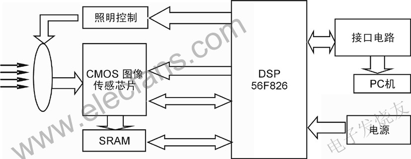 如图1所示,该电路以DSP56F826为核心。当OV7120图像传感芯片准备采集条码图像数据时,DSP发出一个初始信号,控制SRAM重新分配地址块,同时图像传感芯片开始采集条码图象数据。采集完数据并送到SRAM中储存后,DSP开始调用处理程序对数据进行译码,译码完成后,通过SCI RS-232将数据传输到计算机。