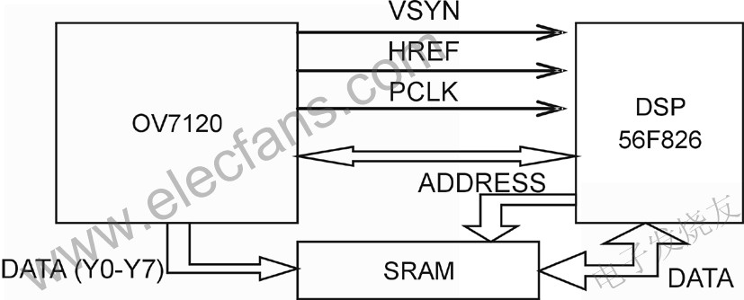 输入5V的直流电作为整个系统的电源。由于图像传感芯片OV7120使用5V电源,MAX202E用5V电源,外部SRAM用3.3V电源,DSP56F826 Core用2.5V电源,而DSP56F826 的I/O口用3.3V电源,所以电源分三路输出。