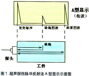 超声探伤时,应用得最多的是A型显示,如图1所示。在A型显示中,横坐标代表被测物的深度,纵坐标代表回波信号的幅度。