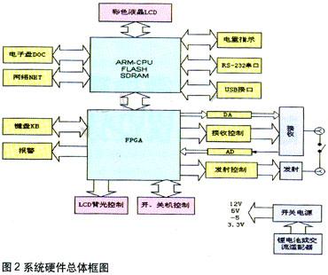 本设计中的嵌入式探伤仪由两部分组成,一部分是模拟信号前端,包括超声发射接收电路及电源电路;另一部分是数字信号采集处理及控制后端,简称超声主控计算机,也是本文主要介绍的部分。系统硬件的总体框图如图2所示。