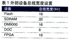 S3C2440地址总线内部是32位(4G),外部27位(128M)。数据总线宽度为32位。当外设芯片与CPU相接时,主控计算机的数据总线宽度可设置为32位、16位或8位模式。设置是在BWSCON寄存器中的DW位实现的。各外部设备的总线接法如表1所示。