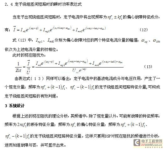 三相异步电动机应用之多,讨论其故障在线监测的方法也很多。本文根据监测定子电流及电压,从分析视在阻抗频谱,利用DSP快速傅氏变换,实时发现电动机的故障,为我们今后的维修提供了很大的方便,具有很强的实际应用价值。