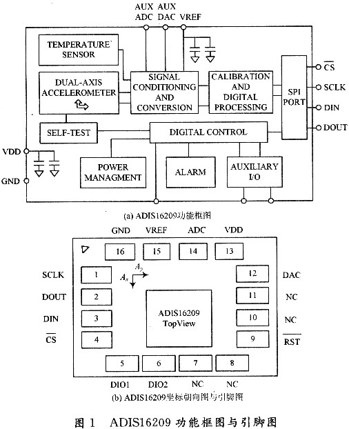 图1(b)是ADIS16209坐标朝向图,传感器测量的Ax与Ay两个方向上的加速度分量。第1,2,3,4引脚是传感器的SPI接口,第9引脚RST是传感器的复位引脚。