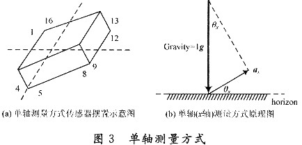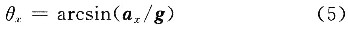 当使用单轴测量方式时,如图3(b)所示,可知Ay轴测得的分量为O,Ax轴测得的分量为ax,那么Ax轴与水平面的夹角: