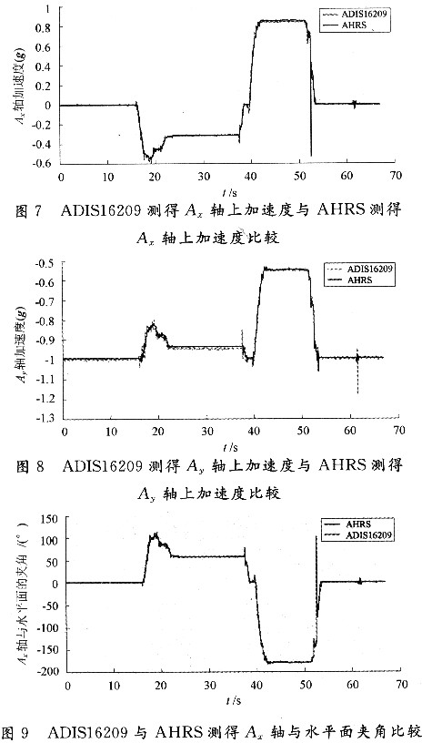 Crossbow Technology公司的AHRS500GA-226是高精度的IMU,其广泛应用于航空航天等高科技领域。实验以AHRS输出的结果为参考,将 ADIS16209与AHRS固定于同一平台上,使得ADIS16209的Ax与Ay轴与AHRS的Ax与Ay轴方向相一致。令它们的Ax与Ay轴组成的平面与水平面垂直,绕着Ax与Ay轴组成的平面的垂直线转动,使Ax与Ay轴与水平面成一定的夹角。图7~图10是ADIS16209与AHRS输出的数据结果的对比,图中主要看较平稳的数据部分,数据抖动部分是因为在切换方向,切换方向时手对传感器有一个加速度,叠加在原来静止状态下受到的力,此时测量到的不能作为准确的结果。