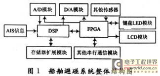本文是在AIS提供信息的基础上,采用DSP和FPGA设计船舶避碰系统。其中高速浮点DSP作为AIS数据接收、船舶避碰算法和系统控制的微处理器。一块容量合适的FPGA集成船舶避碰系统所需其他的I/O功能,实现外围输入输出接口如其他串行口、ADC数据采集缓存等硬件电路,使部分数据采集和数据通信的I/O任务由DSP和FPGA协同承担,从而使DSP减轻负担,可以更专注于避碰的复杂算法。FPGA还可以实现液晶显示接口和键盘接口。通常液晶显示器带有液晶显示控制器,可以方便地与微处理器接口连接。液晶显示接口减少了DSP的外设访问时间。