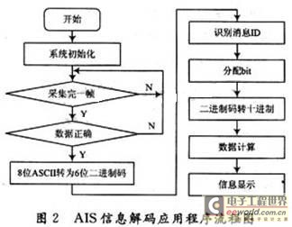AIS信息经过鉴频、解调电路、 RS 232电平转换以后进入微处理器。此处主要由软件实现。系统程序包括系统初始化程序、串口中断程序、数据处理程序、数据显示程序等。系统的初始化包括串口初始化、变量定义、文件设置、数据库的生成及处理等;串口中断程序主要完成AIS数据的采集;数据处理程序主要完成将AIS输出的数据格式转换为其他基于 AIS信息的系统所需的格式,在数据处理过程中必须进行AIS数据的校验判断,以确保采集数据的可靠性;数据显示程序主要完成AIS数据的显示。其中信息解码的程序流程图如图2所示。