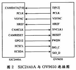S3C2440A可以直接和CMOS图像传感器OV9650连接,如图2所示。OV9650的PWDN引脚与S3C2440A的GPG12引脚相连,这样可以控制OV9650的工作状态。当无须采集图像时,将GPG12输出高电平,OV9650芯片处于掉电模式,节省电能消耗。OV9650可输出YCbCr,RGB两种格式的数据,当输出YCbCr格式时,要用到数据线的D2~D9;当输出RGB格式时,则需要用数据线D0~D9。本文采用YCbCr格式,数据线D2~D9与S3C2440A的CAMDATA0~CAMDATA7相连。