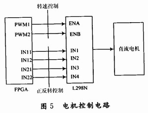 该系统运动控制包括电机控制和舵机控制两部分。电机控制如图5所示,PWM1,PWM2用于控制电机的转速,IN11,IN12,IN21,IN22用于控制电机正反转。舵机控制电路简单,外接有3根线,红色为电源线,黑色为地线,另外一个为PWM信号输入线。两者的主要控制信号是PWM信号,S3C2440A发送命令控制FPGA输出占空比可调的PWM信号。舵机PWM信号的周期固定为20 ms,脉宽分布在1~2 ms之间,因此选定PWM信号频率为50 Hz,占空比固定在5%~10%之间。直流电机PWM信号频率选定10 kHz,占空比可在0%~100%波动,当IN11=1,IN12=0,电机正转且转速随PWM1信号的占空比不同而变化,当IN11=0,IN12=1,电机反转且转速也随着PWM1信号占空比变化。