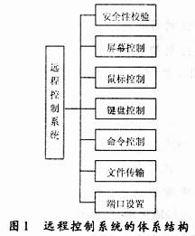 该远程控制系统由服务器端和客户端2个部分组成,客户端可以通过鼠标和键盘控制服务器端的计算机,同时还可以相互传输文件。其体系结构如图1所示,主要由安全性校验、屏幕控制、鼠标控制、键盘控制、命令控制、文件传输、端口设置等6个模块组成。下面具体说明各个模块的功能。