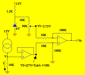 其输出电流是以绝对温度零度(-273℃)为基准,每增加1℃,它会增加1μA输出电流,因此在室温25℃时,其输出电流Iout=(273+25)=298μA。