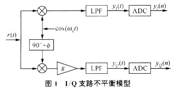 图中LPF代表低通滤波器,ADC代表模数转换器,其中所有处理单元均为一致的,而将幅度不平衡集中表示为g,相位不平衡为φ。且不失一般性,将幅度和相位不平衡均表达在Q路。