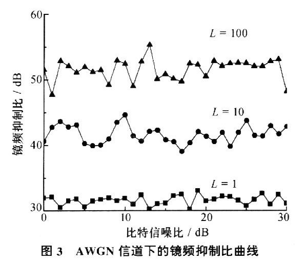 图3和图4分别是在不考虑多径的AWGN信道下仿真的镜频抑制比R和误码率曲线。