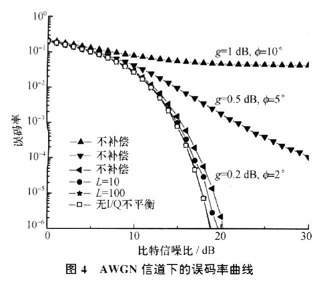 从图4所示的误码率曲线可以看出:1)对3条“△”符号代表的不同I/Q不平衡值曲线,进行I/Q不平衡补偿后均得到相同的BER曲线,说明该补偿方案不受I/Q不平衡值大小的影响;2)若每10帧(L=10)对参数估计值进行一次平均,在110-4误码率处,补偿后的性能与理想曲线之间的信噪比损失约为O.5 dB;若每100帧平均一次,补偿后的性能与理想性能相当。