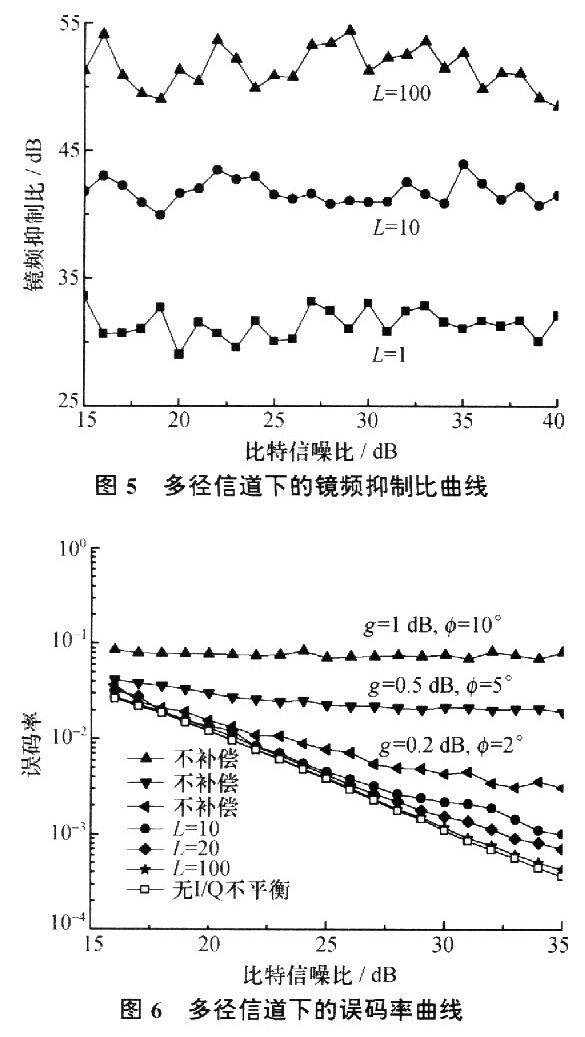 图5和图6分别是在包含AWGN的多径信道下仿真的镜频抑制比R和误码率曲线。