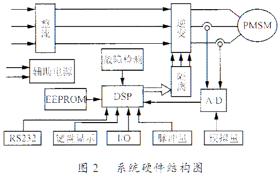 以DSP为核心的伺服系统硬件如图2所示。整个系统的控制电路由DSP组成。DSP作为控制核心,接受外部信息后判断伺服系统的工作模式,并转换成逆变器的开关信号输出,该信号经隔离电路后直接驱动IPM模块给电机供电。另外EEPROM用于参数的保存和用户信息的存储。