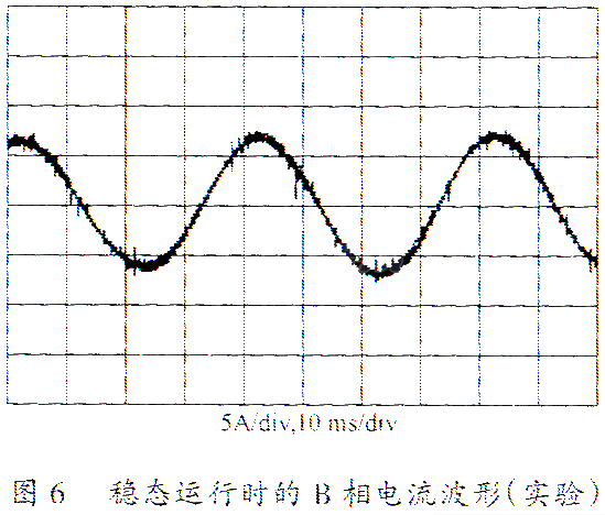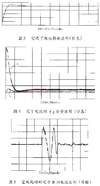 上述伺服系统采用交流永磁同步伺服电机,其额定功率2.5kW,额定电流10A,额定转速2000r/min,额定转矩6N%26;#183;m,定子电感8.5mH,定子电阻2.8Ω。图3为空载下电机额定速度的起动波形,通过仿真获得。图4是定子电流的dq分量起动波形,通过仿真获得。图5是空载起动时的B相电流波形。图6是电机带载稳态运行时的B相电流波形。