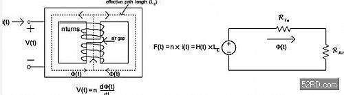 在这个例子,磁动势中大约为磁场强度乘以磁芯的有效长度,有效长度是磁通量环绕磁芯的路径长度,在(图一)(B)的磁性电路中,F(t)可以视为磁通量的来源,最后,磁阻则是物质对磁场的抗拒能力,同时也是磁动势相对于磁通量的比值,也是方程式中磁芯实体结构的函数。