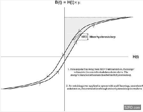 在交换週期中,因磁芯磁性能量变化所造成的能源耗损,为导通时间以磁能方式存入磁芯、以及在关闭时由磁芯所提取磁能量间的差异。因此,存入磁芯的总能量为图二中B-H迴路阴影区域乘上磁芯的体积大小。当电感器电流下降时,磁场强度降低,磁通密度会循着图二中的不同路径(依据箭头的方向)变化,其中大部分的能量会进入负载,储存能量与发出能量间的差,就是能量的耗损。磁芯的能量耗损为B-H迴路所画出的区域乘上磁芯的体积,这个能量乘以切换频率就是功率耗损。迟滞耗损依函数而定,对大部分的铁氧体材料来说,n大约位在2.5到3的范围,但这只有在磁芯没有成为饱和状态、同时交换频率落在规定运作范围内才有效。图二中的阴影区域显示,B-H迴路的第一象限为磁通密度的运作区域,因为大部分的升压式与降压式转换器都以正电感电流运作。