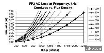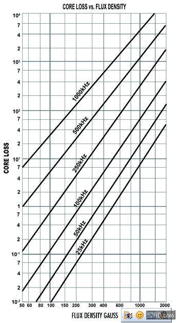 这类曲线,例如(图三)中的铁氧体材料,是以加入双极磁通量变化信号的正弦波变化电压的方式取得,当以方波型式(包含更高频谐波)以及单极磁通量变化,运作进行直流对直流转换器的磁芯耗损估算时,可以使用基础频率以及1/2的峰对峰磁通密度进行,电感器的体积或重量也能够经过测量或计算得出。