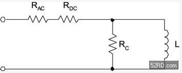 若以(图五)显示简单电路来描述电感器的耗损,其中RC代表磁芯耗损,RAC与RDC分别代表交流与直流绕线耗损,RC可以透过磁芯耗损的估算取得,RAC与RDC则分别为:因表面效应与近接效应所引起的直流绕线电阻与交流电阻。