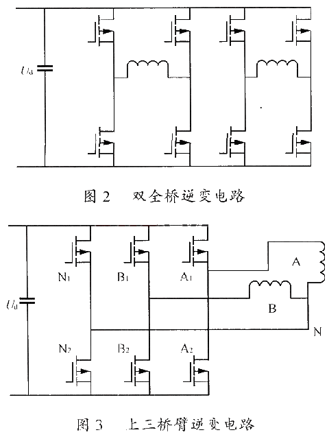 2)全桥逆变电路,由于两相三桥臂需要的开关器件相对较少,易于采用三相电路中六单元功率模块,比起8只开关器件组成的全桥逆变电路优势明显。