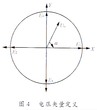 从矢量图来看,在两相半桥逆变电路中,不会产生零电压矢量。为了合成一个幅值为Uα,相角为α的电压矢量,在矢量分解时,其X轴的分量要有E1和E2共同完成,而Y轴分量要由E3和E4共同完成。