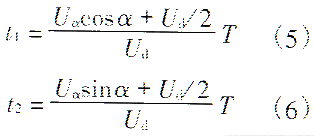 在一个开关周期T内,E1作用的时间为t1,则E2作用的时间为T-t1。E3作用的时间为t2,而E4作用的时间为T-t2。根据矢量分解可以得到式(5)和式(6)(矢量E1,E2,E3,E4的大小均为Ud/2)